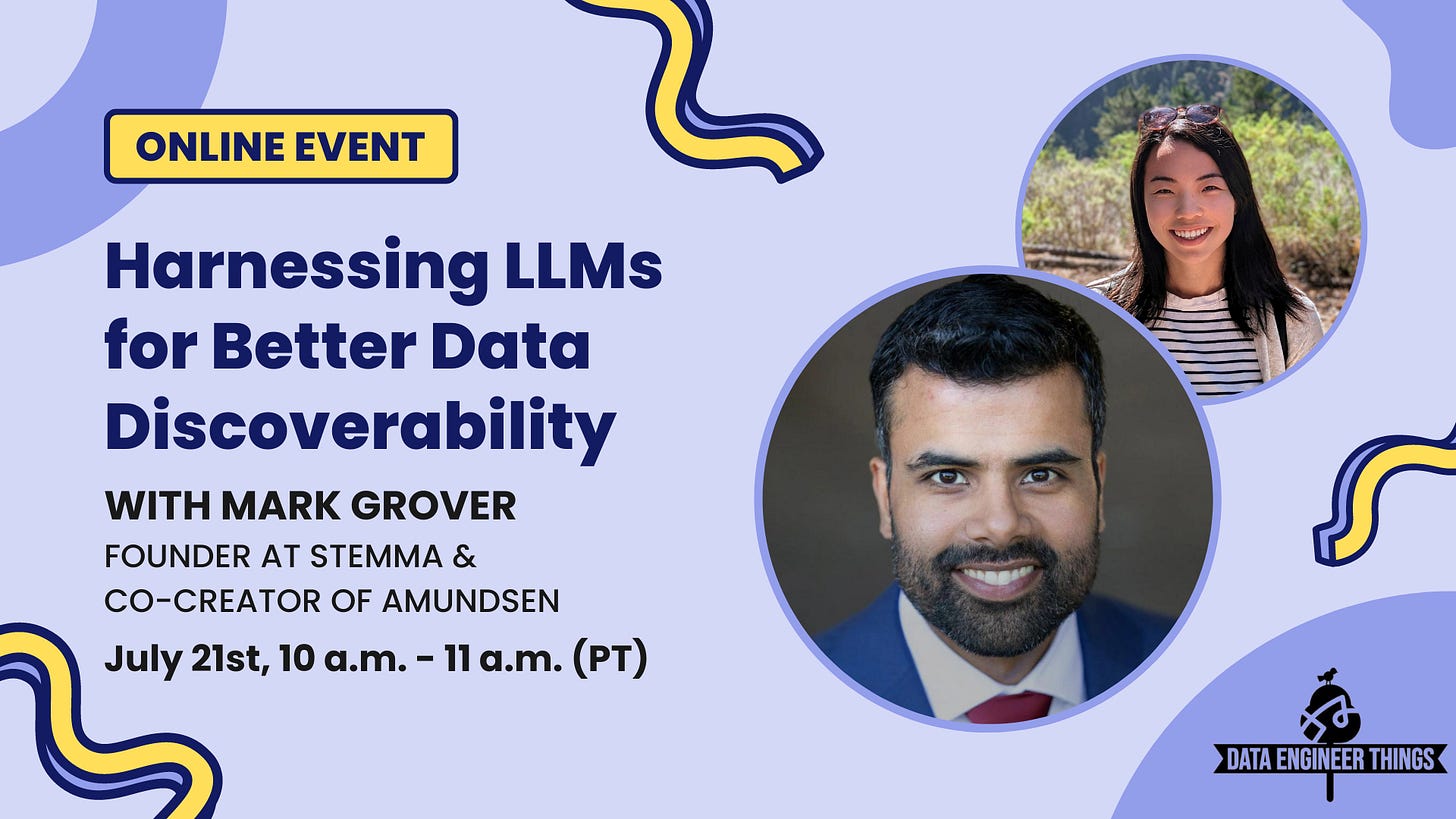 [July 21] [Online] Harnessing LLMs for Better Data Discoverability: Mark Grover, Founder at Semma and Co-creator of Amundsen, will share his insights and learning from using GPT to build AI-powered data discovery features for data engineers and their end users. Sign up HERE.