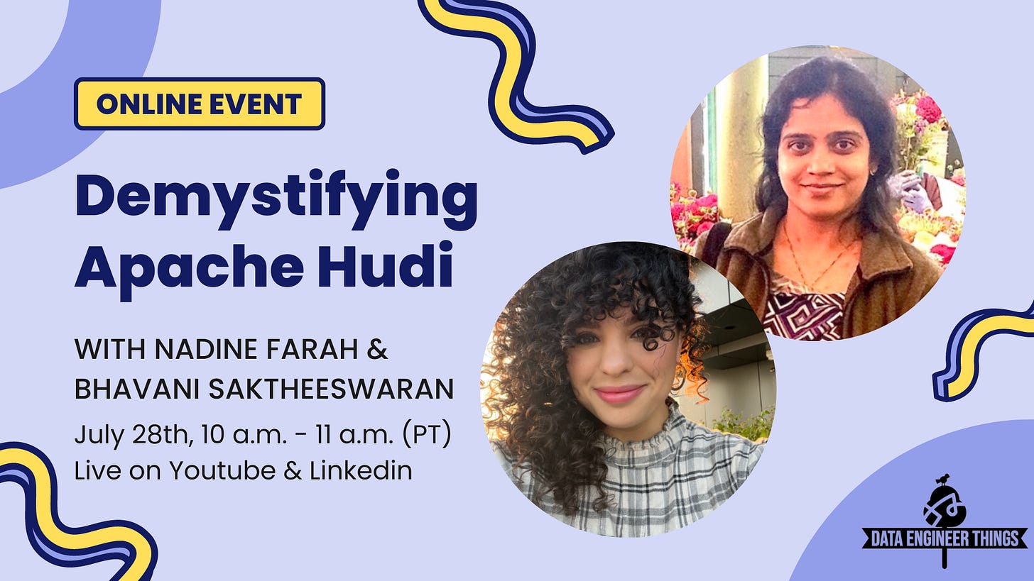 [July 28] [Online] Demystifying Apache Hudi (with Hudi PMC!): Nadine Farah and Bhavani Sudha Saktheeswaran will give us a deep dive into Apache Hudi: including core technical components & concepts, real-world use cases, and a comparison with other data lake frameworks. Sign up HERE.